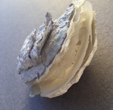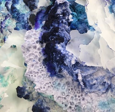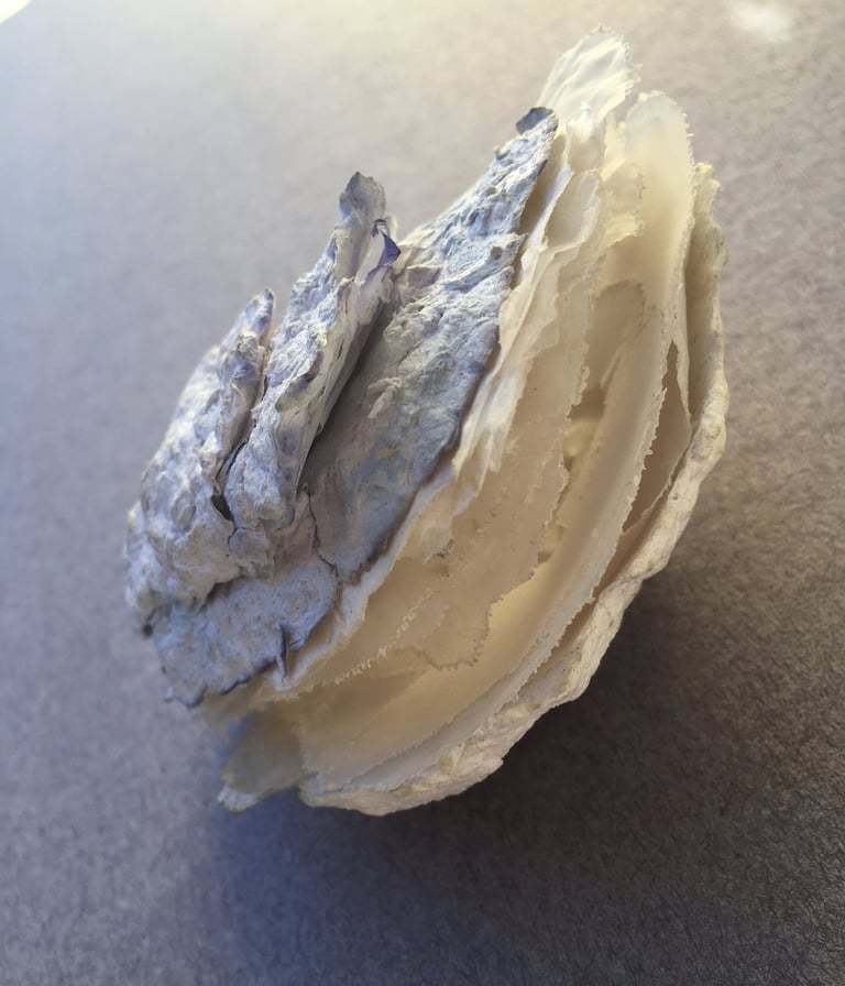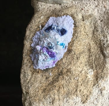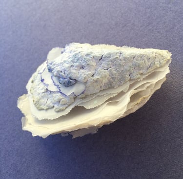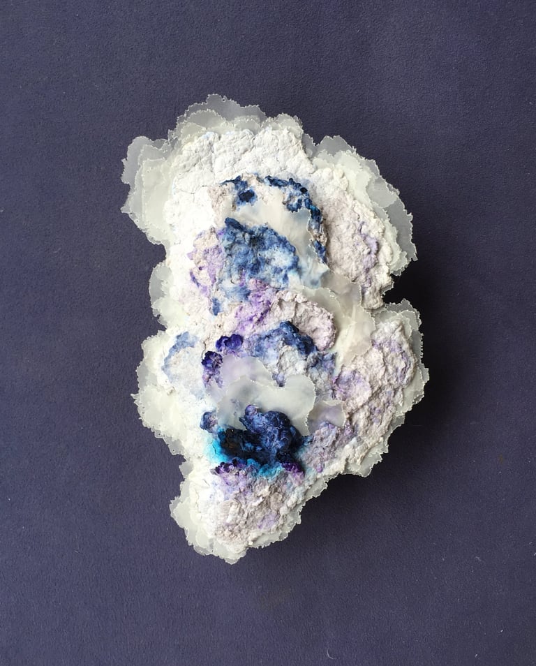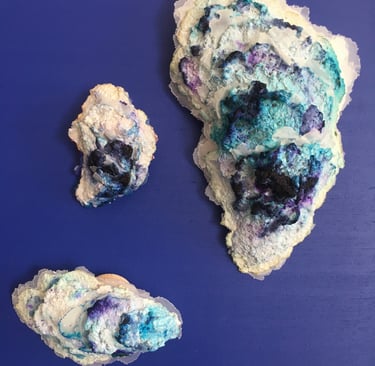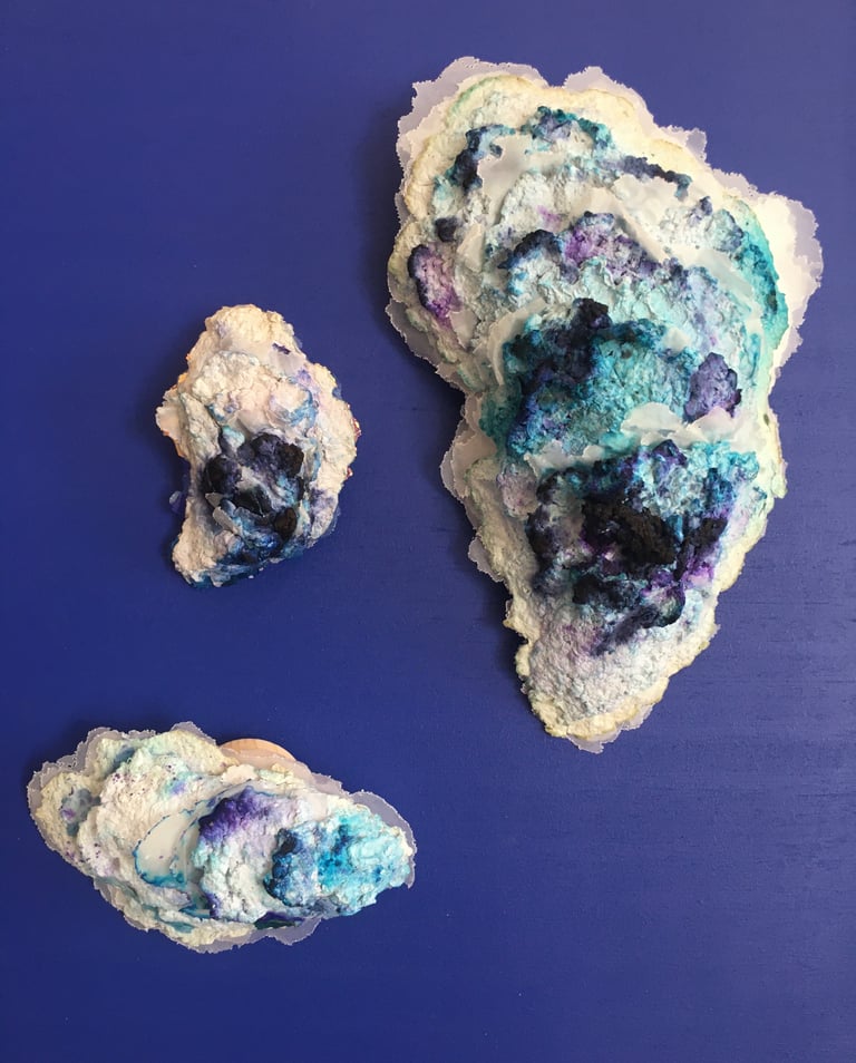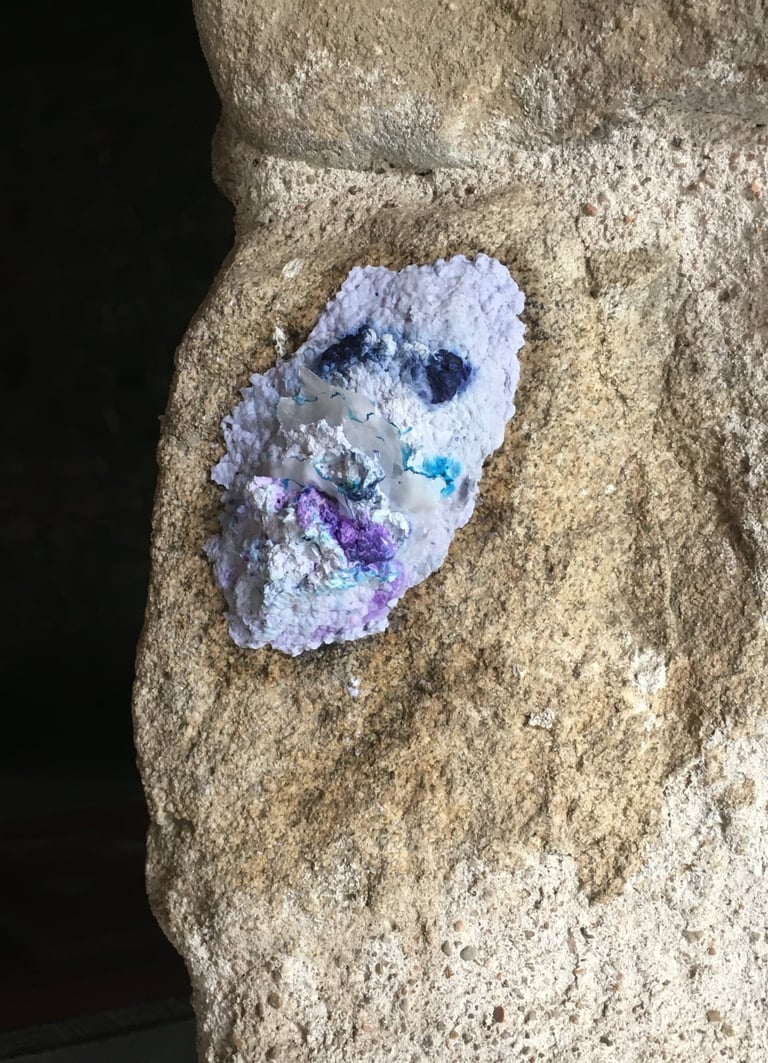 • Les Vulnérables au mur sont des coquillages en pâte à papier créés in situ sur un grand mur de pierre. Tels des mollusques s’agrippant sur le rocher, ils rythment de taches bleues la surface minérale dans une vraisemblance marine qui interroge et qui affirme leur caractère éphémère et fragile.